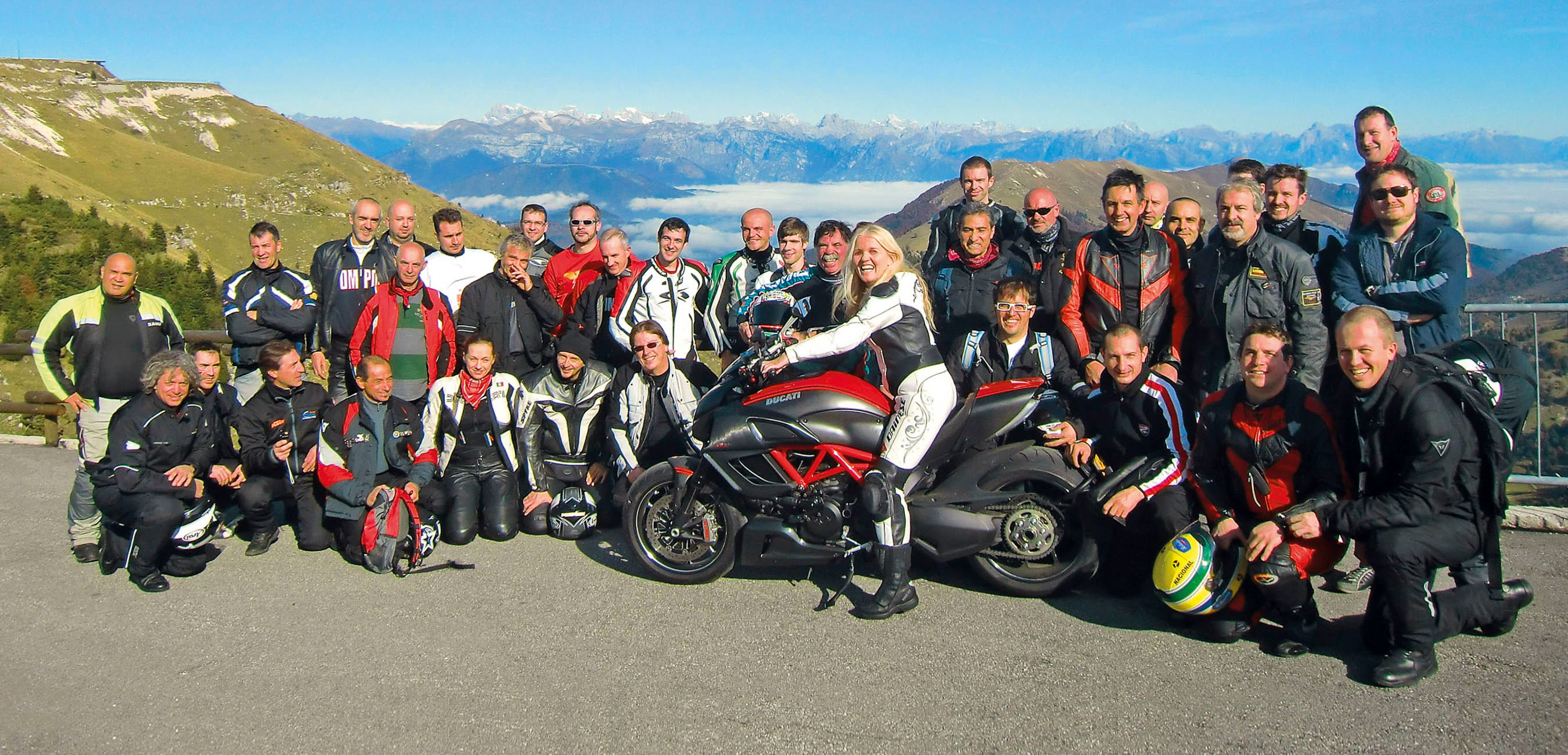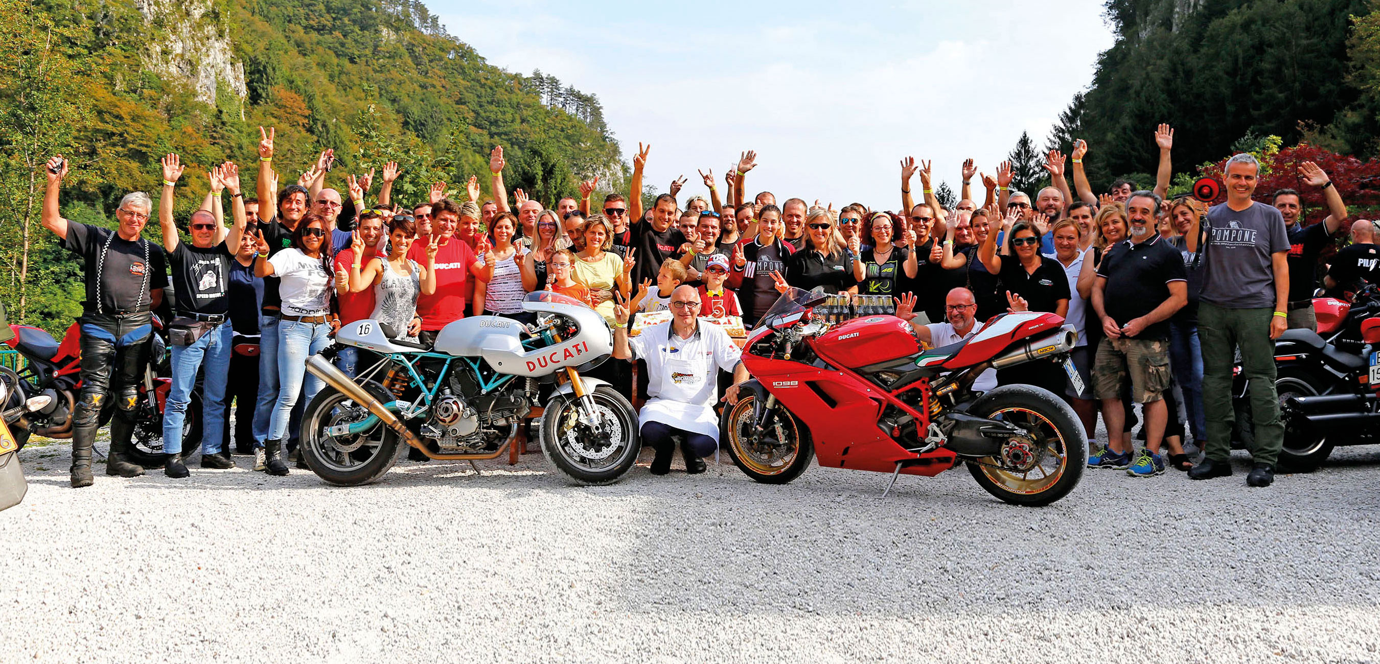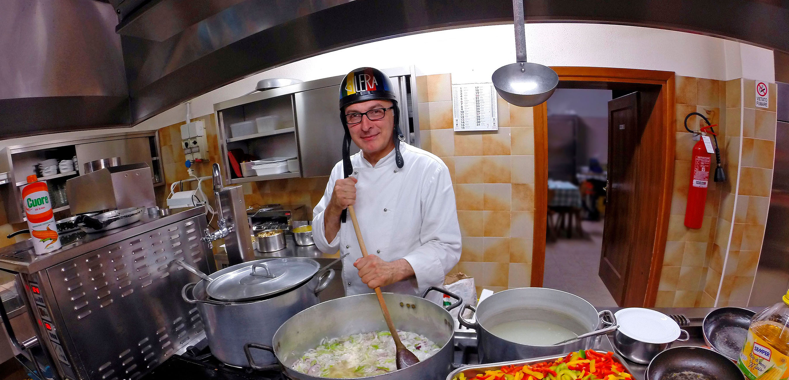 " Mi chiamano anche Mr Pompone. Cosa faccio nella vita? Spadello, vado in moto, cucino, chiacchiero, organizzo, dirigo e ho una qualifica non riconosciuta come categoria: sono un motoristoratore! A volte mi chiedono se il mio ristorante è in movimento… sì, quasi come le moto che ho guidato nella mia "carriera"…."
