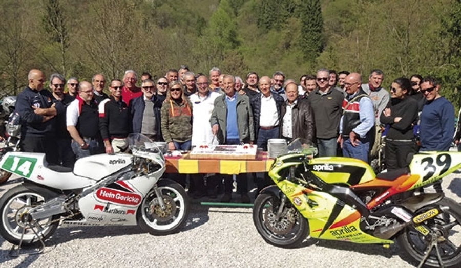 Abbiamo incontrato alcune volte il Presidente Ivano ed erano sempre momenti gradevoli. Ma questo era un po’ diverso, volevamo averlo in sede Pompone, tutto per noi. Allora vi svelo come iniziava il contatto: notavo che guardava i messaggi in FB, nella sua pagina e nostra di club, ho messo un messaggio in linea che volevamo organizzare un evento con lui e poi invitavo una ventina di utenti a condividere l’idea. Dopo qualche giorno, ricevo un messaggio con il sì e lascio a lui la scelta del giorno, che sarà l’8 aprile. Tutto ok, però iniziava il momento cruciale della scelta dei suoi ospiti e dei fans Aprilia per colorare questa giornata di festa dove l’aria del fatto a Noale doveva completare l’atmosfera. L’arena era il Motoristorante, Max Sartor coordinava la zona park Aprilia e coronava il suo sogno di amante del marchio, che aspettava da tempo. Roberto Cognolato portava in esposizione ben 4 Aprilia 250 GP ex di vari piloti, alle quali si aggiungeva uno spettacolare Quad con motore Aprilia 1000 V 60, costruito dalla FGM di Padova. A pranzo ultimato Ivano ringraziava i partecipanti, rispondeva alle varie domande e raccontava interessanti aneddoti al riguardo della sua vita in Aprilia. Ma il momento saliente era quando presentava i suoi collaboratori e si capiva che erano una buon team e una grande famiglia. Ragazzi, non è stato facile, ma è stato bello riunire gli elementi di un tale staff, che voglio nominare: Maurizio e Mariano Roman, Gianfranco Frison, Luciano Bertoncini, Leandro Scomazzon e Caio Pellizzon. Che bello rivivere i tempi andati e vedere questo gruppo di motociclisti coinvolto e interessato. Fuori all’aperto si finiva in bellezza, le foto immortalavano i presenti e si concludeva con il taglio torta, sublime momento dove tutti sono protagonisti. Grazie Presidente di averci regalato questa giornata di motociclismo vero, Aprilia e Noale saranno sempre nei nostri cuori.